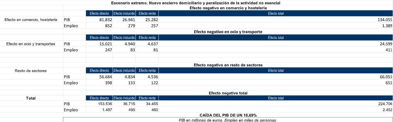Por último, si quienes quieren cerrar de nuevo todo el sistema productivo se imponen, entonces el tejido empresarial se resentirá del todo y nos iremos a un escenario con una caída cercana al 20% y la pérdida de casi 2,5 millones de empleos.