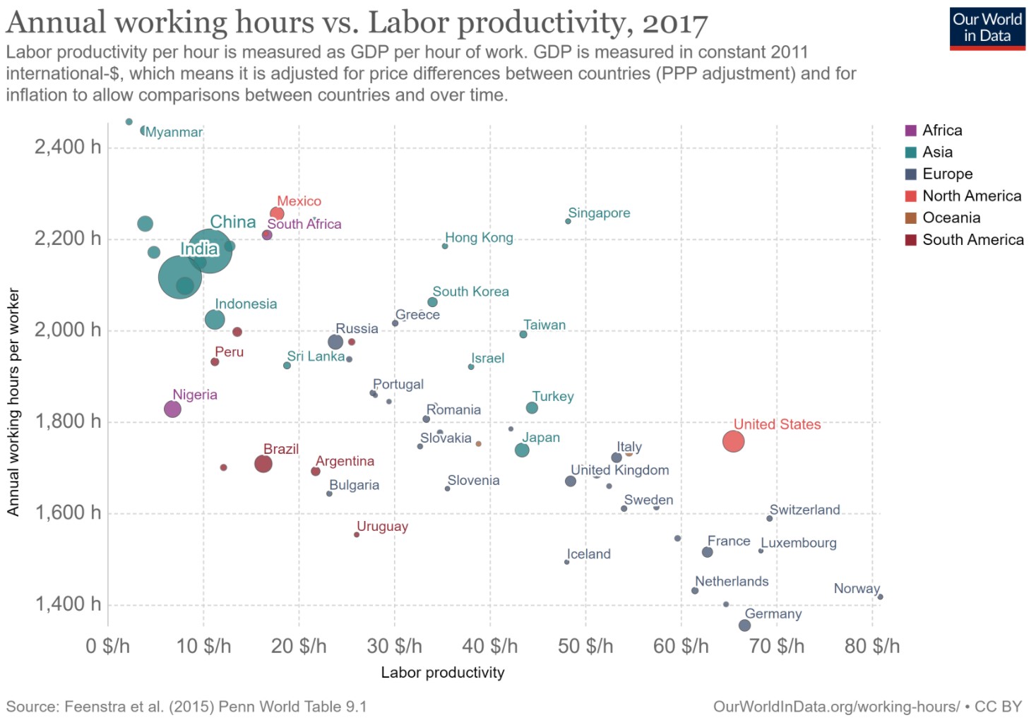 Sobre el primer gráfico no nos extenderemos demasiado. Lo explicaba perfectamente nuestro compañero Jesús Esteban hace unos días en Libre Mercado: a más productividad, menos horas trabajadas. No siempre este descenso se produce de igual forma. Por ejemplo, en los países asiáticos o en los anglosajones (muy ricos), el número de horas por trabajador no ha caído tanto como en Europa. Las diferencias culturales y las prioridades también influyen aquí.