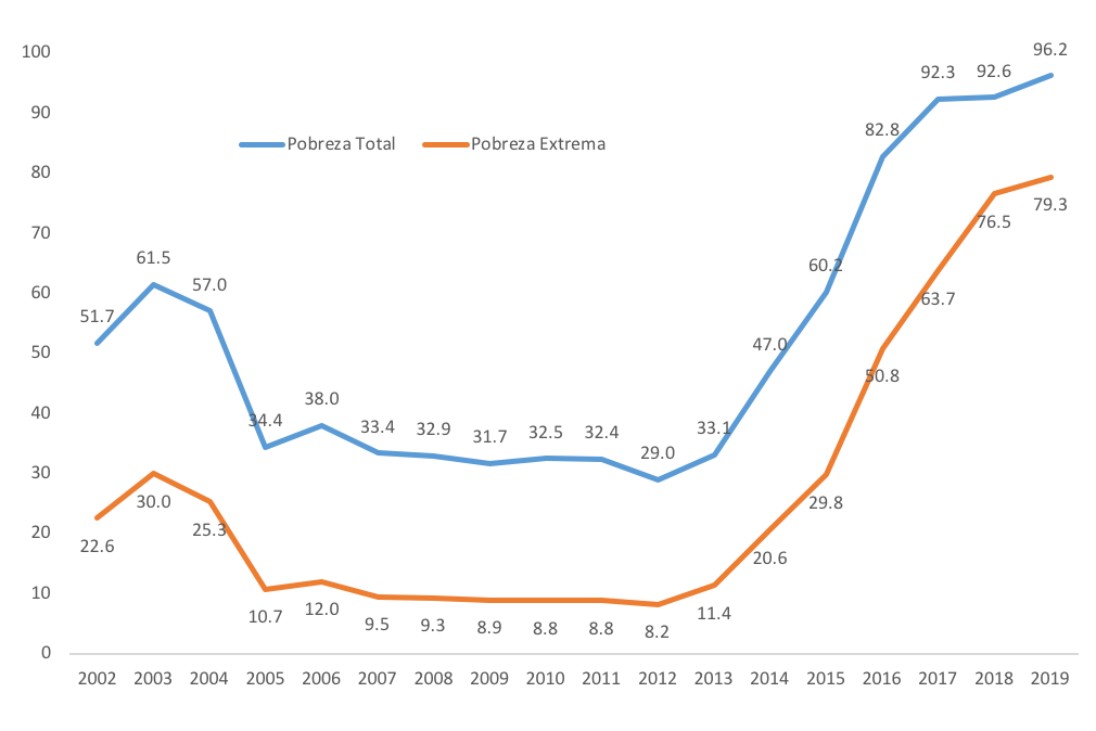 Todo ello se traduce en un drástico empobrecimiento de la población. El 96% de los hogares están en situación de pobreza, lo cual significa que carecen de ingresos suficientes para poder cubrir el doble de las calorías diarias recomendadas, según la última encuesta de condiciones de vida Encovi. Pero es que, además, el 80% no tiene siquiera recursos para cubrir ese nivel básico de alimentación.