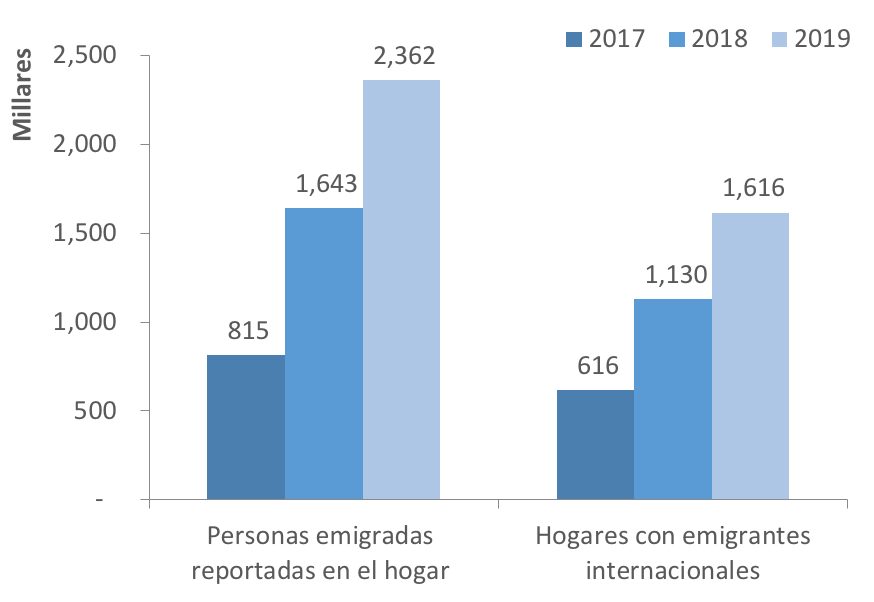 Venezuela también está experimentando una de las mayores migraciones de la historia en ausencia de guerra. Las estadísticas disponibles reflejan la salida de entre 2 y 3 millones de personas entre 2017 y 2019, a una media de un millón al año, mientras que la ONU proyecta 5 millones de emigrantes, superando incluso el éxodo masivo que causó la reciente guerra de Siria. El 20% de los hogares venezolanos admiten que al menos uno de sus integrantes ha emigrado desde 2014.