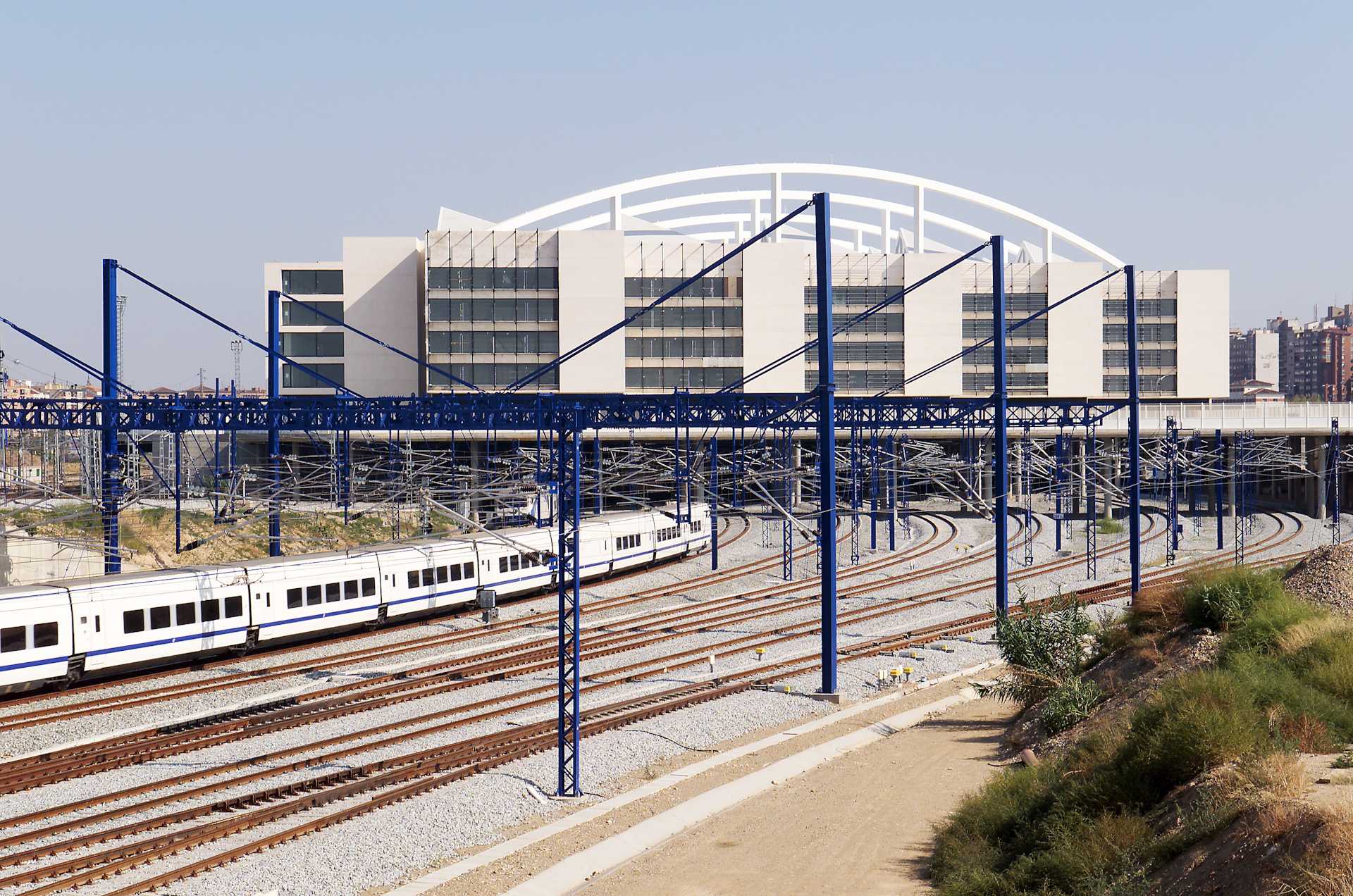 Finalizada en el año 2003, el conjunto arquitectónico de la estación de Zaragoza Delicias engloba un grupo de edificios que, si bien se vertebran todos en torno a la estación ferroviaria que le da nombre, tienen usos distintos. Así, además de la estación ferroviaria, que asumió tanto el tráfico de alta velocidad como el regional y de media distancia, y que tiene una superficie útil de 62.851 m2 incluye una estación de autobuses de 22.788 m2, dos aparcamientos con una superficie de 72.761 m2 y un complejo hotelero, comercial y de ocio con 19.804 m2 de superficie útil. La playa de vías de la estación Zaragoza-Delicias, también ejecutada por Ferrovial, dispone de cinco vías de ancho normalizado europeo de 1.435 mm y cinco vías de ancho ibérico de 1.668 mm.