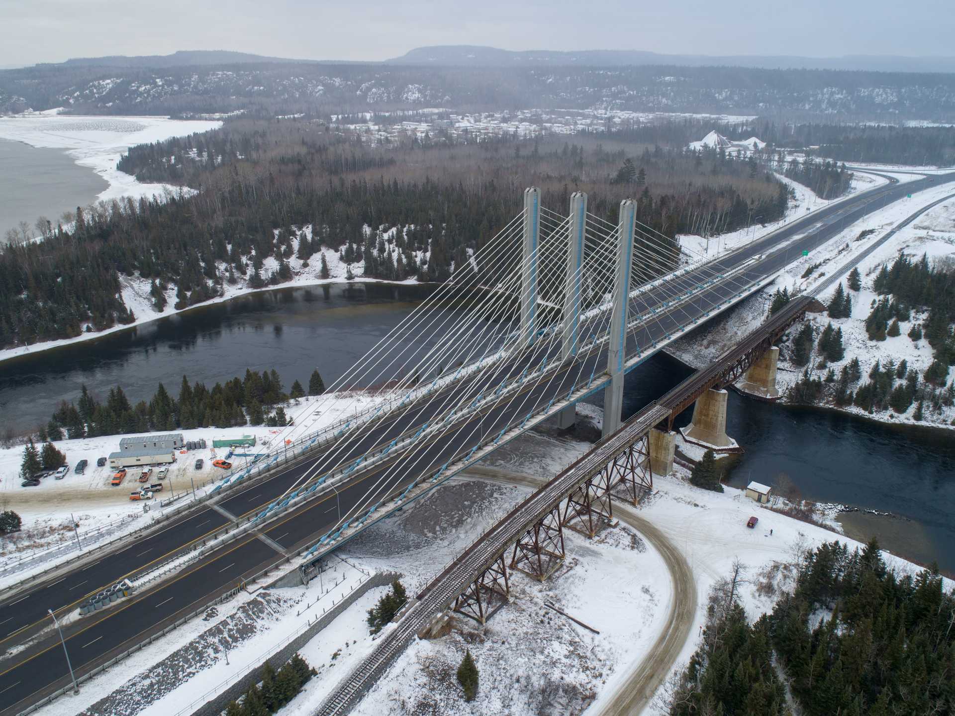 El puente construido por Ferrovial sobre el río Nipigon, es un proyecto que forma parte del plan general de mejora y ensanche de la Transcanadian Highway 11/17, autopista que conecta las costas este y oeste de Canadá. Se trata del primer puente atirantado que se construye en la provincia de Ontario. La infraestructura cuenta con una longitud de 252 metros y cuatro carriles de circulación. La solución técnica está basada en la construcción de un muelle central con tres torres, desde el que parten los cables que enlazan con los pilares laterales. De este modo, se elimina la necesidad de instalar estructuras dentro del río.