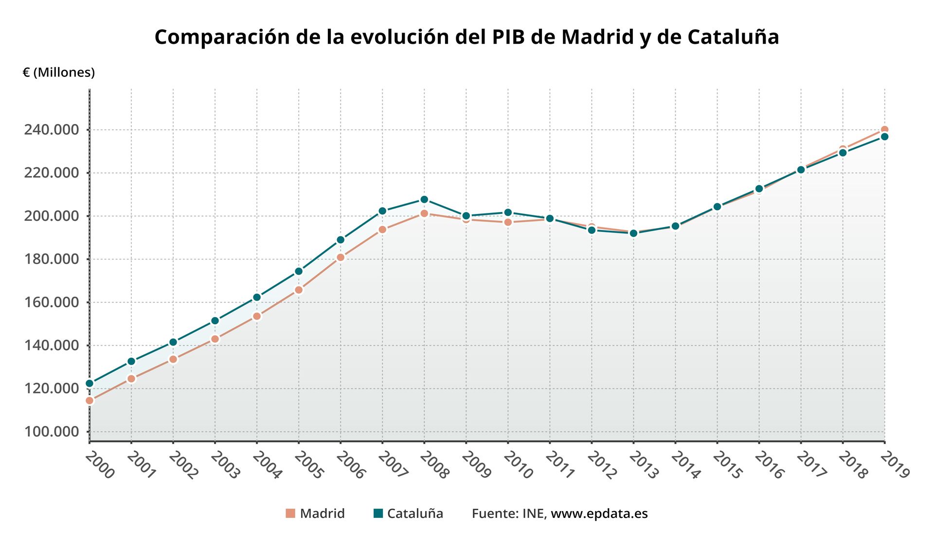 El Instituto Nacional de Estadística (INE) ha confirmado este jueves que la Comunidad de Madrid repitió en 2019 como la mayor economía regional, con un PIB que suponía el 19,3% del total, por delante de Cataluña (19%), a la que ya había superado en 2018.