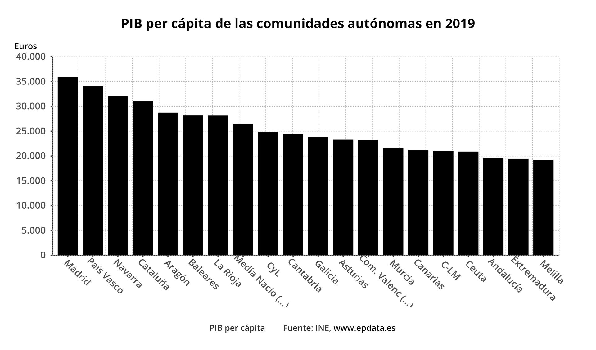 También en términos de PIB por habitante la Comunidad de Madrid encabezó la clasificación, con 35.913 euros, seguida de País Vasco (34.142 euros), Navarra (32.141 euros) y Cataluña (31.119), muy por encima de la media nacional (26.426 euros).