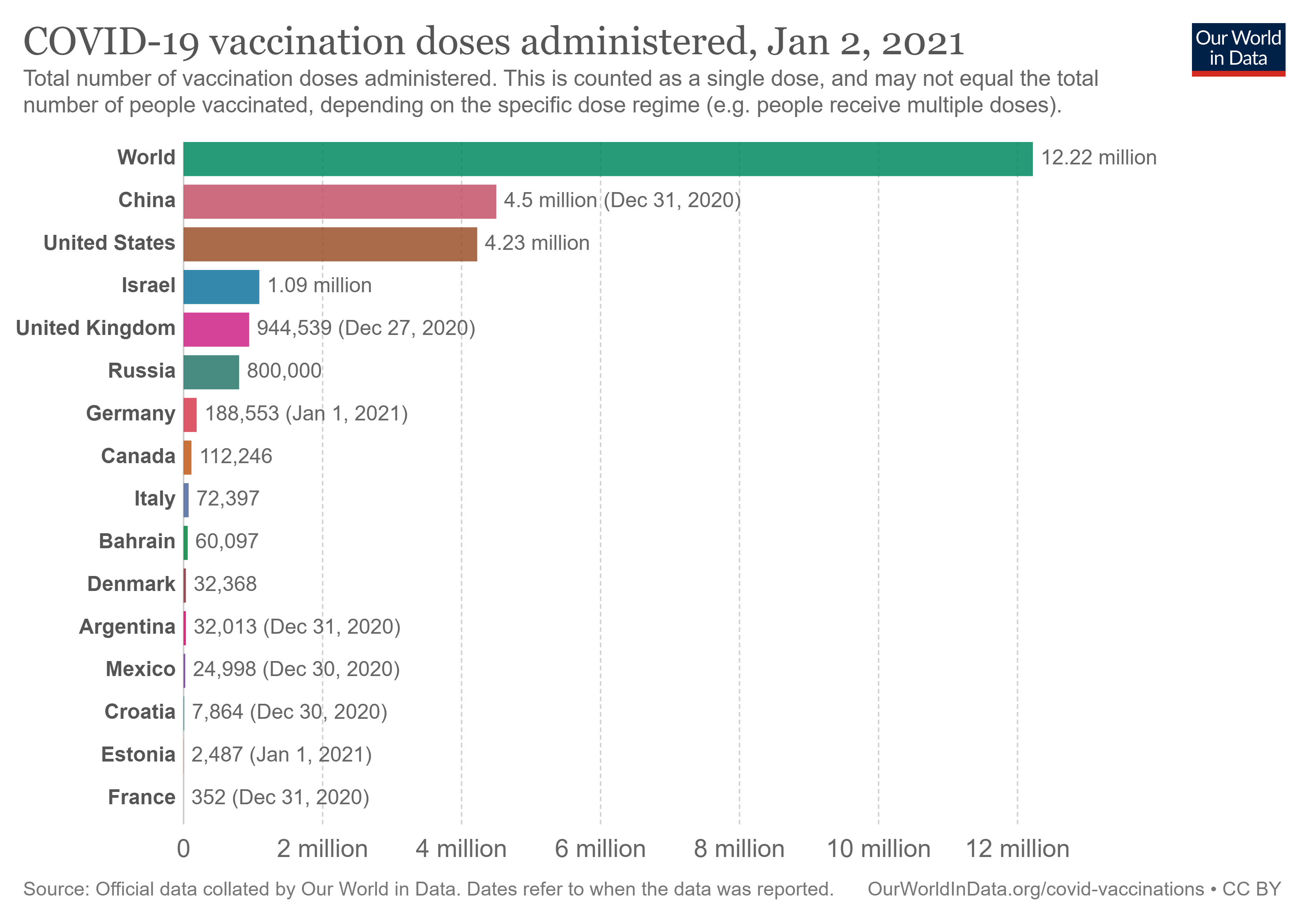 Según esta entidad, que lleva días recopilando los datos oficiales de vacunación que publican los diferentes países, ya se han administrado más de 12 millones de dosis contra el coronavirus en el mundo.