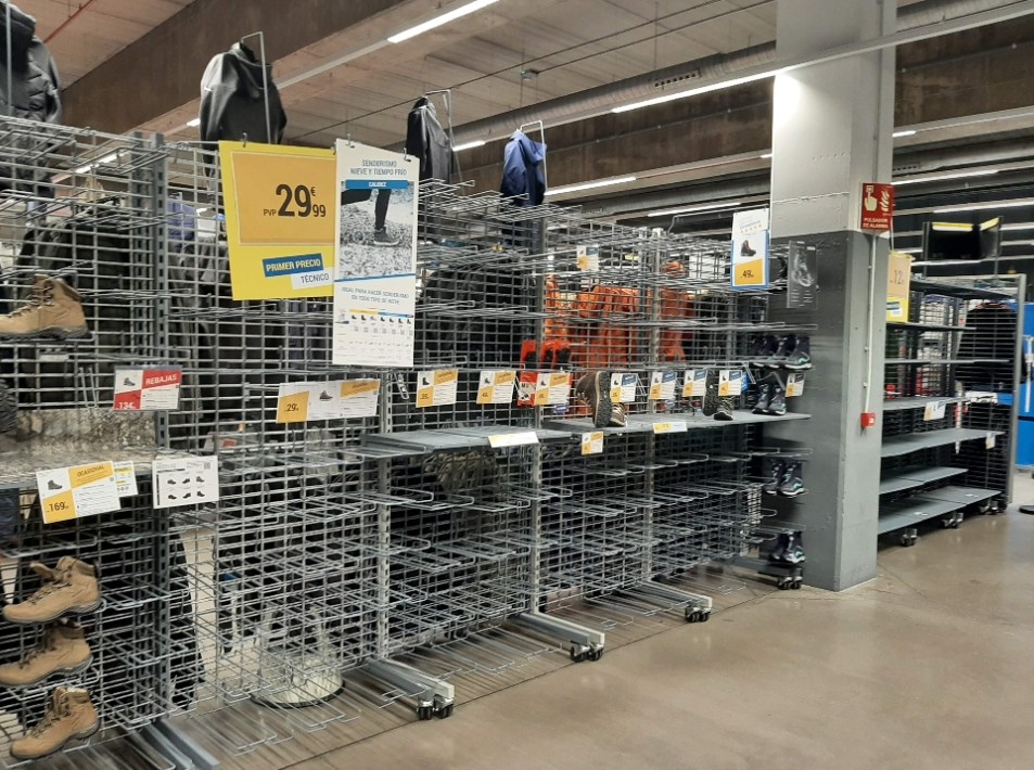 En Madrid más de lo mismo. "Ayer fuimos a Decathlon después de comer para comprarle a mi hijo unas botas de nieve y unas manoplas para que jugara estos días y, cuando entramos, ya nos encontramos con que no quedaba absolutamente nada en la zona de niños. En Rivas, la zona de los guantes y las camisetas interiores estaba completamente arrasada... quedaban tres abrigos y una camiseta pequeña. De las botas, no quedaba ninguna de ningún precio. Ni de niños, ni de adultos", cuenta Aída, una clienta. Ha sucedido lo mismo en San Sebastián de los Reyes, como se observa en las imágenes.