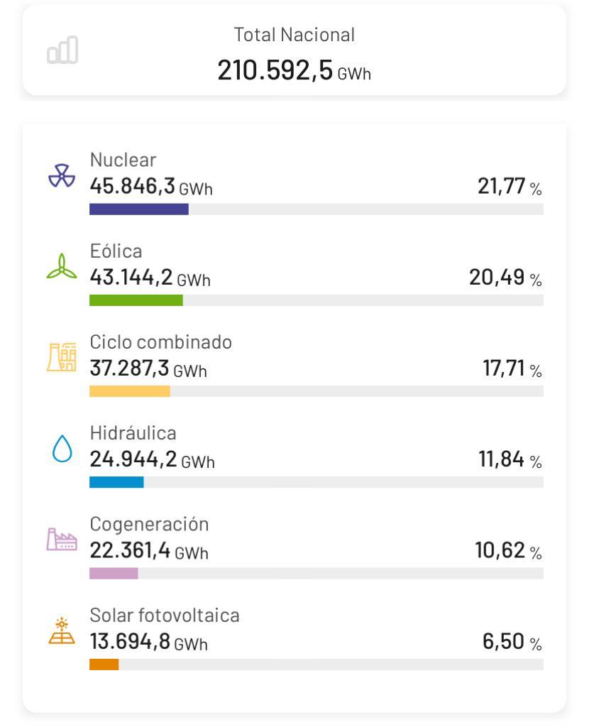 A continuación, con los datos de Red Eléctrica a cierre de 2020, puede verse el peso de los distintos tipos de energía de los que se nutre España.