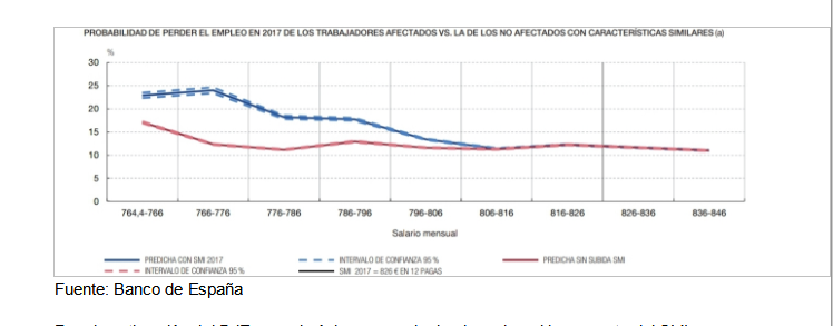 El Banco de España publicó en 2019 una estimación sobre las consecuencias de este aumento. Según su investigación, de los 384.000 trabajadores afectados por el SMI, 12.000 perdieron su empleo como consecuencia de la subida, lo cual compensó el efecto del aumento salarial del resto de trabajadores afectados y causó que la masa salarial no variase como consecuencia del aumento. Esto hace aumentar la desigualdad, al conservar algunos trabajadores su empleo con un mayor salario y perder otros su empleo. Según el Banco de España, el aumento del Índice de Gini por esta medida fue de 0,2%.