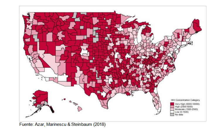 Sin embargo, esto no es una excusa para subir siempre el Salario Mínimo, pues el mismo estudio demuestra que, en los mercados menos concentrados, el aumento del SMI puede causar un significativo aumento del desempleo. En el mapa inferior puede observarse el grado de concentración económica en Estados Unidos, según el Índice de Herfindahl, representando los colores más oscuros los mercados más concentrados y viceversa.