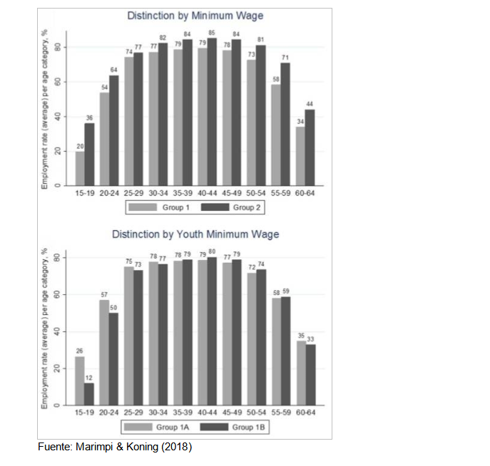 Sus conclusiones se pueden apreciar en las gráficas inferiores, en las que el grupo 1 de la primera se refiere a la tasa de empleo en países con Salario Mínimo y el grupo 2, a países sin él. En el siguiente gráfico, el grupo 1A, hace referencia a países con un Salario Mínimo distinto para jóvenes y el grupo 1B, a países con un mismo Salario Mínimo para todos los grupos de edad.