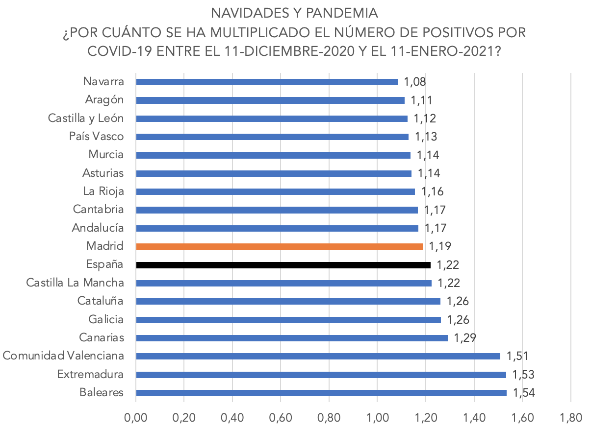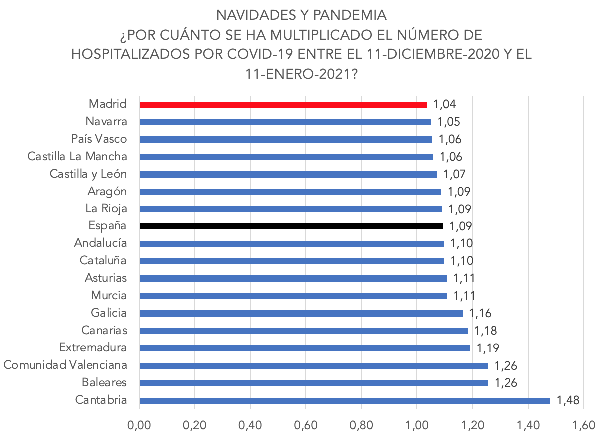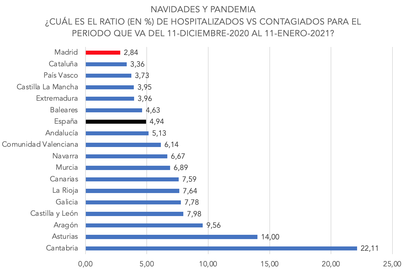 Si calculamos el ratio de nuevos contagiados vs nuevos hospitalizados, podemos comprobar también que Madrid es la región con un menor porcentaje de ingresos hospitalarios en relación con los positivos detectados. Su acumulado de hospitalizados creció en 1.925 personas, mientras que los positivos diagnosticados fueron 67.813, de modo que solo el 2,84% de los contagios del periodo navideño han terminado en el hospital.