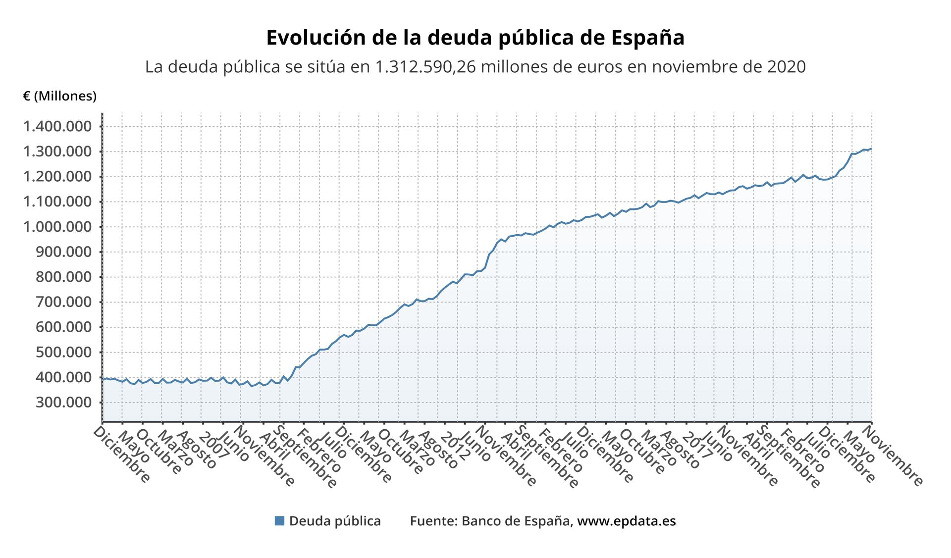 La deuda del conjunto de las administraciones públicas registró un incremento del 0,5% en el mes de noviembre del año pasado, al sumar 6.562 millones de euros en un mes, marcando un nuevo máximo histórico de 1.312.590 millones de euros, en torno al 114,5% del PIB, como consecuencia del mayor gasto y los menores ingresos derivados de la crisis del coronavirus, según los datos publicados este lunes por el Banco de España.