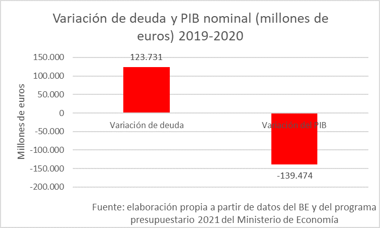 En dicho cociente, ya está comenzando a operar el efecto negativo tanto en el numerador como en el denominador, pues la deuda aumenta en 123.731 millones de euros entre diciembre de 2019 y noviembre de 2020 y el PIB se estima que se reduzca en 139.474 millones de euros de 2019 a 2020.
