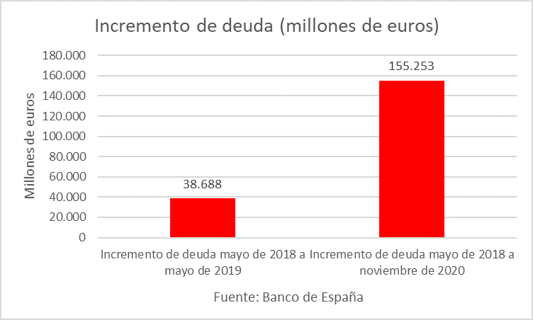 De nuevo, con la reciente publicación de los datos de deuda por parte del Banco de España, se constata que el endeudamiento prosigue su ascenso de manera incesante también en el mes de noviembre de 2020, último registro publicado.