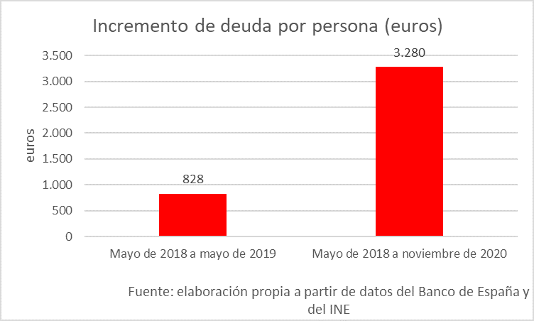 Así, si durante el primer año creció la deuda por persona en 828,03 euros, en los dos años y medio de mandato de Sánchez la deuda por persona ha aumentado en 3.280 euros, casi cuatro veces el incremento del primer año.