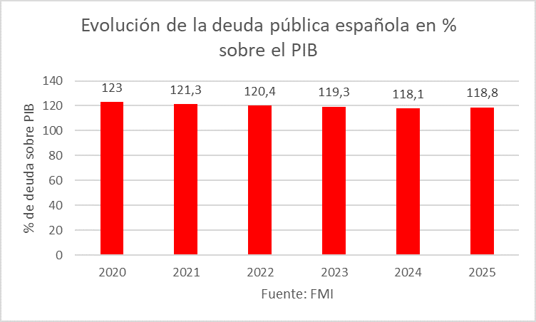 De esa manera, nos encontramos con un incremento exponencial del gasto, una caída en picado de la recaudación y un descenso notable del PIB. Todo ello, hará que la deuda española se sitúe este año entre el 115% y el 125% del PIB, dependiendo de cuál sea la intensidad final del movimiento de déficit y PIB (el gobernador del Banco de España ha llegado a mencionar que incluso podría alcanzar el 128,7% este ejercicio), siendo factible que supere el 130% en 2021. De hecho, el FMI estima que la deuda cerrará 2020 en el 123% del PIB, para quedarse en el 118,8% en 2025, año que, además, subirá de nuevo sobre 2024.