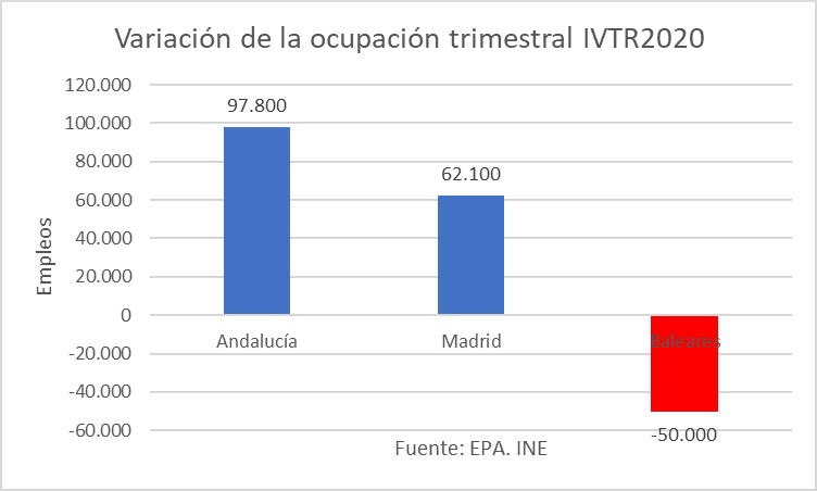 No obstante, de ese incremento trimestral del empleo, son Andalucía, con 97.800 empleos más, y Madrid, con 62.100 nuevos puestos de trabajo, quienes lideran la creación de empleo en España en el trimestre. Es decir, el 95,52% del empleo creado en el trimestre se produce en esas dos regiones. Baleares, por el contrario, lidera la destrucción de empleo, al perder trimestralmente 50.000 puestos de trabajo.