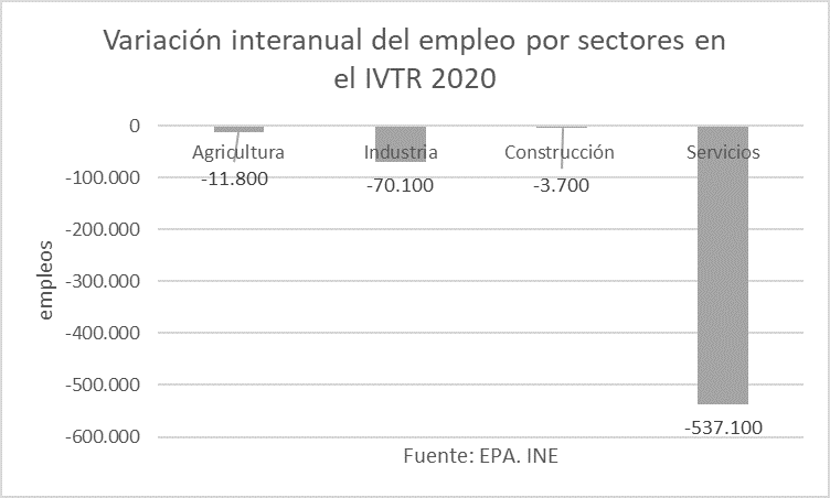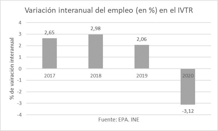 Frente a los incrementos interanuales de ocupación de los cuartos trimestres de 2017, 2018 y 2019, con un 2,65%, un 2,98% y un 2,06% respectivamente, el empleo cae en el cuarto trimestre de 2020 un 3,12%.