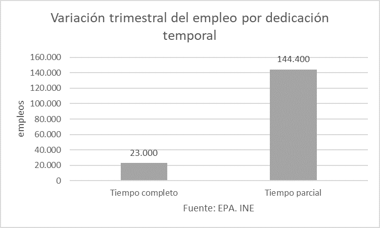 Del incremento trimestral de empleo, realmente sólo un 13,74% es a tiempo completo, pues la inmensa mayoría (144.400 de los 167.400 empleos nuevos en el trimestre) son a tiempo parcial, lo que denota la menor capacidad de generación de empleo.