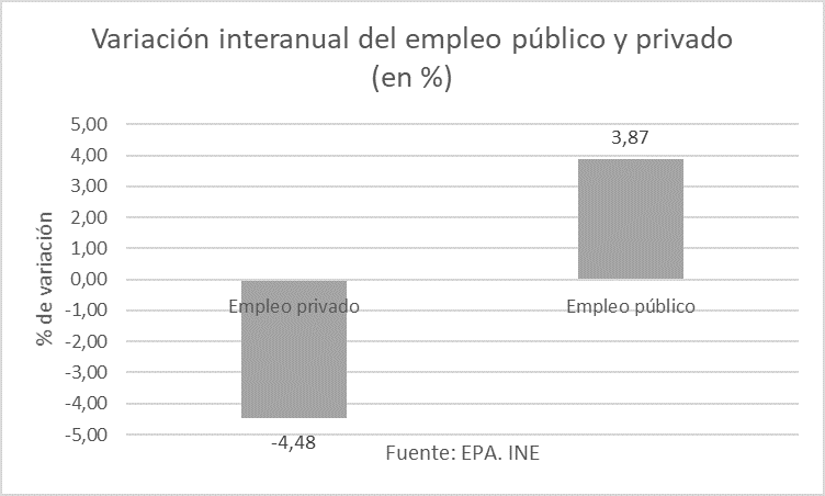 El empleo privado disminuye un 4,48% en tasa interanual, mientras que el empleo público aumenta un 3,87% en el mismo período. Es decir, si los datos no son todavía peores se debe al fuerte incremento de empleos públicos habido en 2020.
