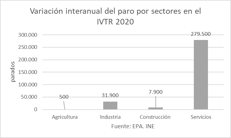 El paro desciende en 3.100 personas en el trimestre, cifra escasa para dicho trimestre, y aumenta en 527.900 personas, un 16,54% en tasa interanual. Si considerásemos como parados a los que se encuentran en situación de ERTE, habría casi 800.000 parados más. Andalucía, con 25.100 parados menos es quien lidera el descenso del paro trimestral.