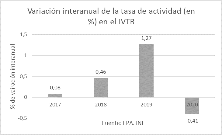 Aunque la tasa de actividad sube ligeramente en el trimestre por la búsqueda de empleo que posibilita el fin del encierro domiciliario, en tasa interanual cae un 0,41%, cuando en el mismo trimestre de 2017 subía un 0,08%, en el de 2018 crecía un 0,46%, y en el de 2019 se incrementaba un 1,27%.