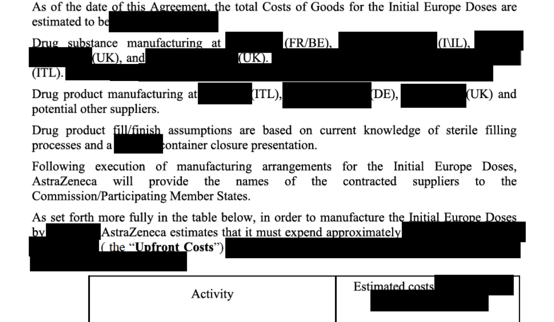 "Las partes acuerdan que, sin perjuicio de cualquier otra disposición de este acuerdo y mientras AstraZeneca reconoce que su obligación es suministrar las dosis de la vacuna sin lucro, no se solicitará ni requerirá que AstraZeneca suministre las dosis de vacuna con pérdidas. Las partes acuerdan además que los costos iniciales estimados en 336 millones de euros y los costos de llenado / acabado / empaque de (tachado) (…) se determinaron en base a estimaciones disponibles en la fecha de vigencia de las dosis iniciales para Europa. "