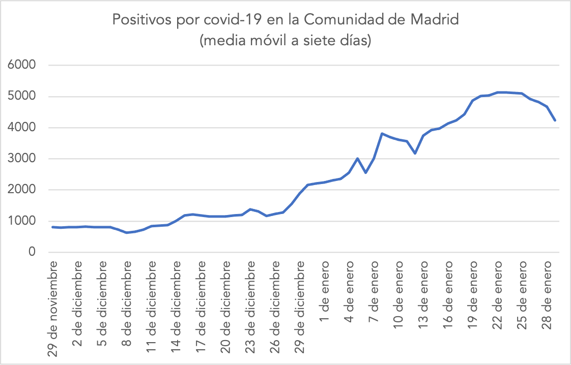 En primer lugar, la cifra de positivos diarios toca techo el 19 de enero y, desde entonces, empieza a moverse en niveles más bajos. Pero, para filtrar mejor la variabilidad del dato diario, conviene analizar los positivos en media móvil a siete días. Haciendo dicho análisis, mucho más útil para observar al tendencia, podemos comprobar que la estabilización se alcanzó el 20 de enero, dando pie a una pendiente descendiente desde el 26 de enero.