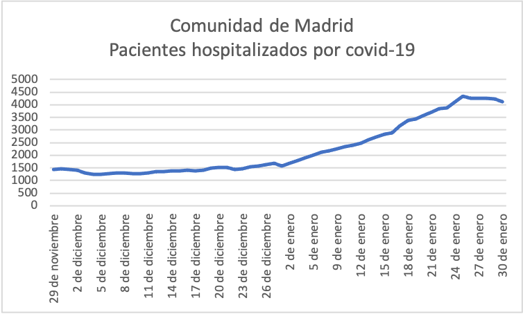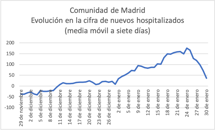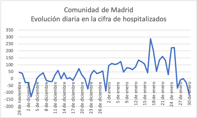 La evolución diaria en la cifra de hospitalizados acredita un cambio a mejor tras varios "picos" alcanzados entre el 17 y el 25 de enero. De hecho, desde el 26 de enero se están dando cifras negativas, que significan que el número total de ingresados se está reduciendo, al haber más altas que nuevos hospitalizados.