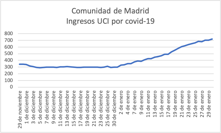 Incluso en los datos UCI, que han seguido creciendo en números absolutos como antes se comentó, el "pico" de nuevos ingresados se produjo el 25 de enero y, desde entonces, se registran datos 3,5 veces más bajos. De igual modo, este mismo indicador calculado en media móvil a siete días muestra un punto de inflexión que marca un cambio a mejor el 26 de enero.