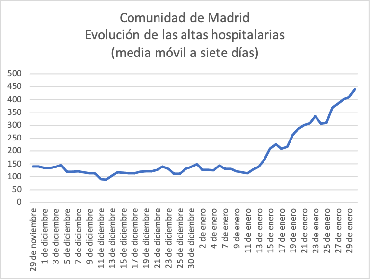 Esa mejora queda patente en los dos siguientes gráficos. El primero muestra cómo han subido las altas de pacientes hospitalizados en media móvil a siete días. La tendencia es clara y describe una línea ascendente desde el 10 de enero. El segundo muestra el promedio de nuevos ingresados diarios, también en media móvil a siete días, un ejercicio que muestra una incidencia decreciente desde el 25 de enero.