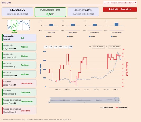 Según señalan los indicadores técnicos premium de Estrategias de Inversión, el valor, que persiste en su modo alcista, alcanza una puntuación total de 8,5 puntos sobre los 10 posibles. Sólo en negativo el volumen a largo plazo que se muestra decreciente y también el rango de amplitud a medio plazo que es creciente. El resto, favorable para el valor. Con tendencia a medio y largo plazo alcista, momento total, lento y rápido positivo, volumen a medio plazo creciente y volatilidad del valor a largo plazo que se muestra decreciente.