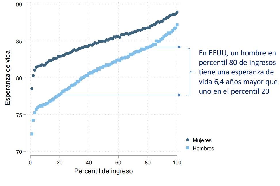 El ministro se apoyó en el este gráfico, con datos de EEUU. Y anunció que su departamento estaba buscando las cifras de España, pero que, por lo que ya se sabía, no habría muchas diferencias. En esto tiene razón, lo normal es que salga un gráfico similar para cualquier país del mundo: en casi todos ellos, la esperanza de vida es más elevada para los trabajadores de sueldos más elevados (normalmente asociados a profesiones de las llamadas de "cuello blanco": desde directivos a abogados, pasando por consultores, políticos, funcionarios de alto nivel, etc...).