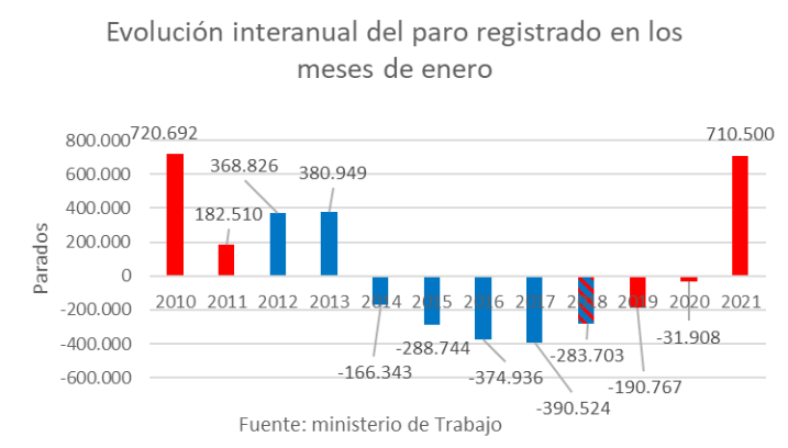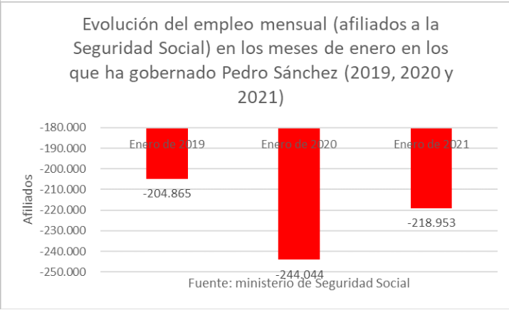 De esa manera, en los tres meses de enero en los que ha gobernado Pedro Sánchez (enero de 2019, enero de 2020 y enero de 2021), se han destruido más de 200.000 empleos cada uno de esos meses.