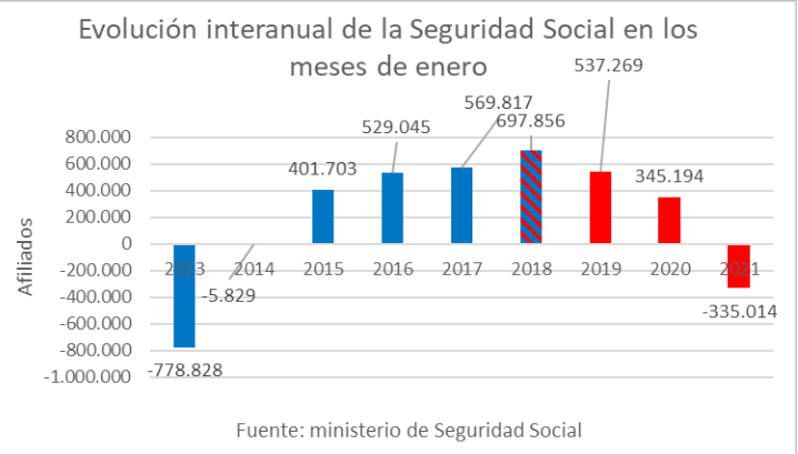 Y el dato en términos interanuales se remonta, en negativo, a los peores momentos de la anterior crisis. De esa manera, los afiliados en tasa interanual caen en 335.014 personas, que es el peor dato interanual de un mes de enero desde 2013.