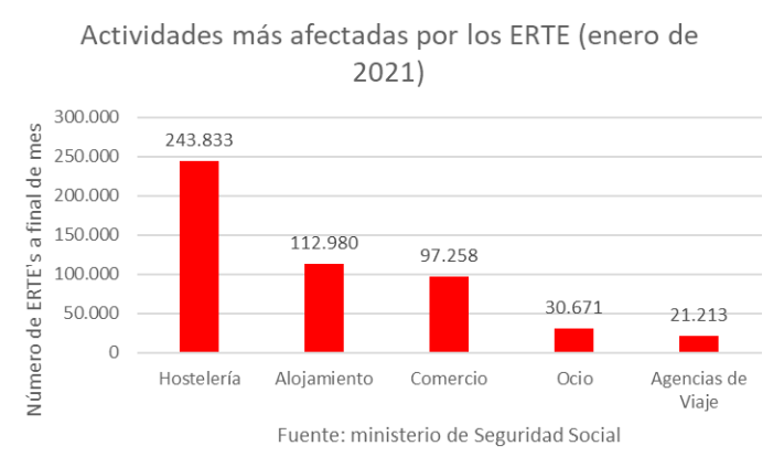 Adicionalmente, de esas 738.969 personas que se encuentran en ERTE, el 68,47% se concentra en la hostelería, los servicios de alojamiento, el comercio, las actividades de ocio y las agencias de viajes, que con las medidas actuales y el penoso ritmo de vacunación tienen un horizonte más sombrío.