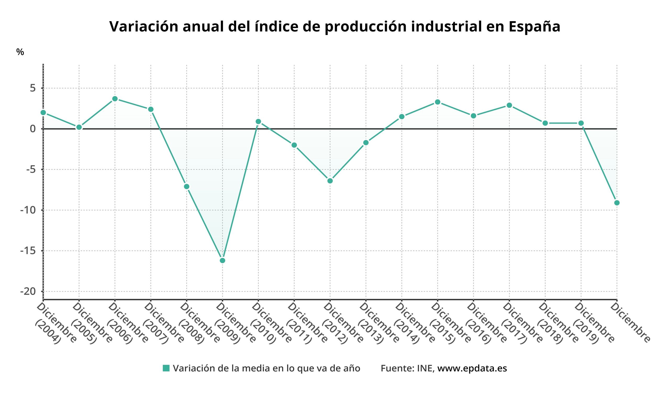 El Índice General de Producción Industrial (IPI) descendió una media del 9,1% en 2020, registrando su mayor caída desde el ejercicio 2009, cuando este indicador se hundió un 16,2% en plena crisis financiera, ha informado este lunes el Instituto Nacional de Estadística (INE).