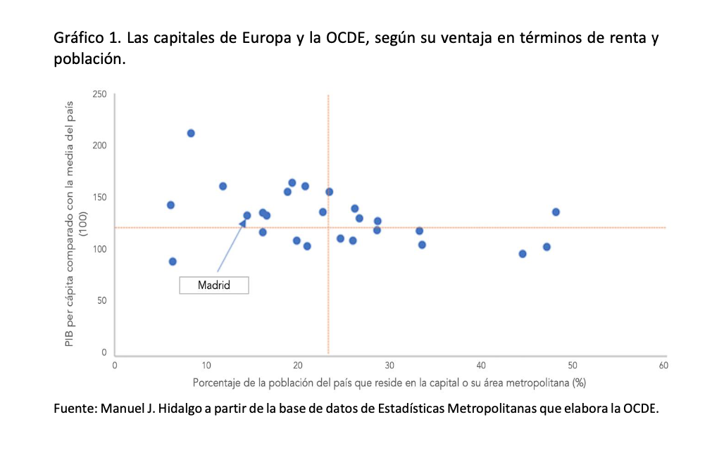 De hecho, la Comunidad de Madrid ha estudiado la ventaja relativa que tienen distintas capitales de Europa y la OCDE en dos variables clave: población y renta por habitante. En ambos indicadores, Madrid figura en la zona media-baja del ranking, lo que significa que España es uno de los países desarrollados en el que la ciudad capital tiene menos ventaja relativa en términos demográficos y económicos.