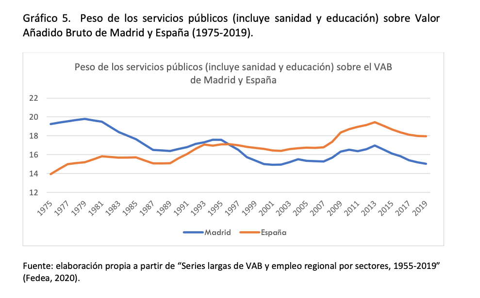 "Cuando estudiamos el peso de los servicios públicos (incluidas la sanidad y la educación) sobre el Valor Añadido Bruto, encontramos que Madrid ha reducido el peso de estos sectores desde 1975 hasta la actualidad (cae del 19,2% al 15,0%), mientras que en toda España ha ocurrido todo lo contrario y la contribución al crecimiento de los servicios públicos ha ido a más (sube del 13,9% al 17,9%)", explica el estudio.