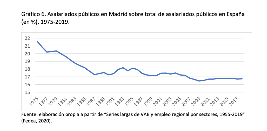 Por otro lado, "si medimos qué peso tienen los asalariados públicos radicados en Madrid sobre el total de trabajadores del Estado en el conjunto de España, vemos que su cuota ha bajado del 21,6% al 16,7%. Sucede, pues, lo contrario a lo que aducen quienes hablan del "efecto capitalidad", pues Madrid tiene hoy mucho menos empleo público que antaño. De hecho, si comparamos el peso de los asalariados públicos sobre el total de asalariados, vemos que Madrid está un 8% por debajo del promedio nacional".