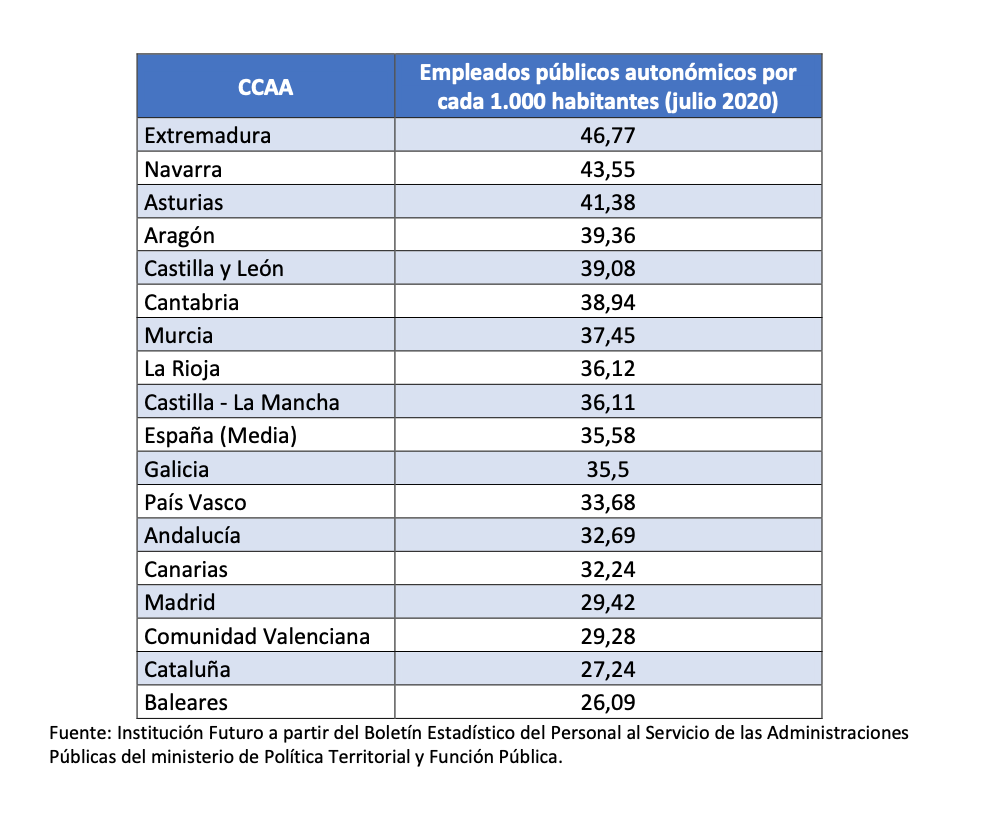 Por último, el estudio presentado por Fernández Lasquetty subraya que, "si nos fijamos estrictamente en la plantilla del gobierno regional encontramos, de hecho, que Madrid tiene una de las administraciones más eficientes de España en cuanto al número de trabajadores autonómicos per cápita. Esto confirma que las políticas autonómicas reducen el peso de la capitalidad sobre la estructura económica de Madrid, al apostar por un modelo basado en el empleo que genera el sector privado".