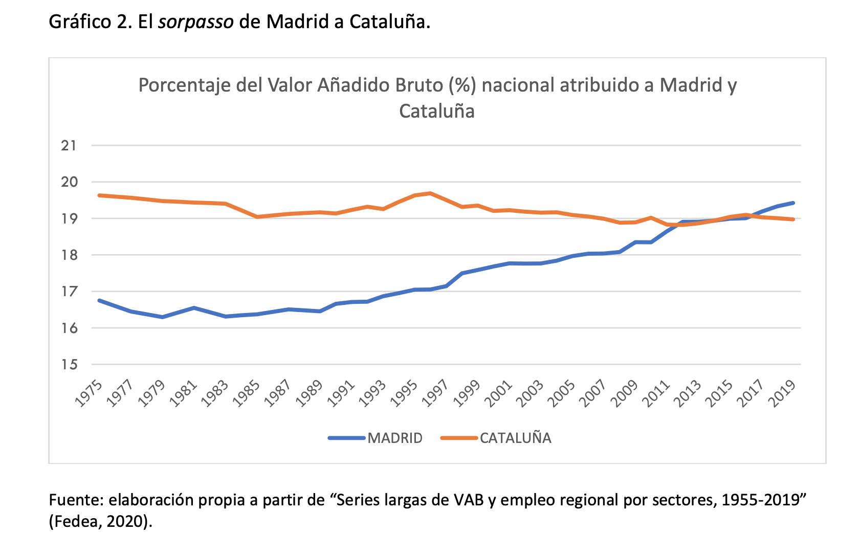 Según explica el estudio del gobierno madrileño, "la velocidad de crecimiento de Madrid fue similar a la de Cataluña hasta mediados de los 90. En cambio, en el último cuarto de siglo, este diferencial se ha disparado a favor de Madrid, hasta el punto de que Madrid ha logrado el sorpasso y ya tiene un PIB más elevado que Cataluña, a pesar de tener un millón menos de habitantes".