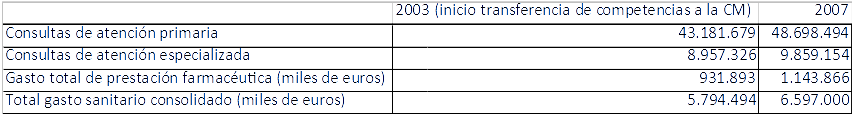 Por eso, en dicho período inicial (2003-2007), se llevó a cabo buena parte de la gran extensión de la sanidad madrileña: el esfuerzo presupuestario se incrementó en alrededor de 1.000 millones de euros, los hospitales públicos pasaron de 25, al ser transferidas las competencias de Sanidad, a 33, el número de recetas aumentó en casi 12,5 millones, las consultas de atención especializada aumentaron en un millón y los profesionales sanitarios colegiados se incrementaron en casi 9.000.