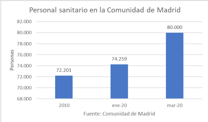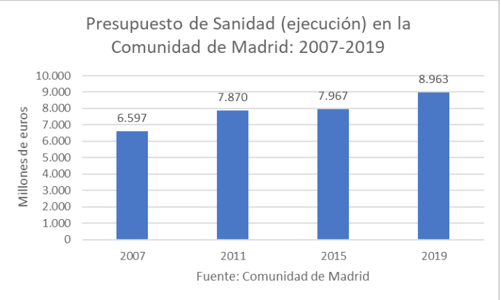 No obstante, y pese a entrar en 2007 en la anterior y dura crisis económica, Madrid eliminó gastos superfluos y centró todo su esfuerzo presupuestario en Sanidad: mientras el presupuesto total descendía, el porcentaje del peso de Sanidad sobre el total aumentaba. Así, si en 2007, inicio de la crisis, el peso de la sanidad sobre todo el presupuesto madrileño era del 40,1%, al finalizar la misma, en 2015, se había elevado hasta el 48,9%.