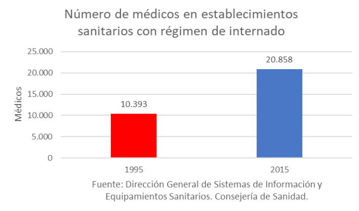 Es más, si analizamos el número de médicos en establecimientos sanitarios con régimen de internado, vemos cómo evolucionan desde 10.393 en 1995 hasta 20.858 en 2015, al final de la crisis.
