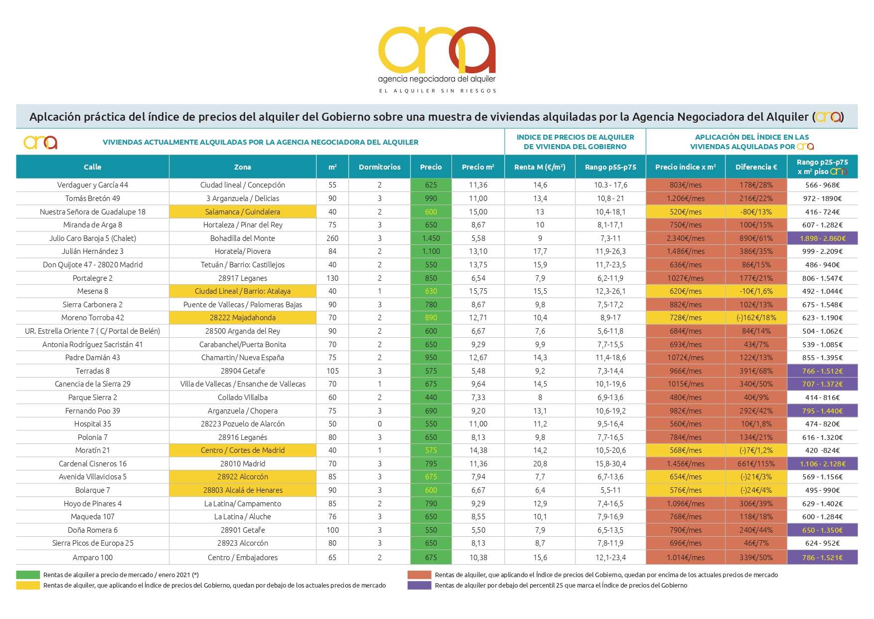 El estudio de ANA refleja que en 23 de las 29 viviendas seleccionadas -el 79%- la renta media que recoge el índice estatal es superior al precio que actualmente pagan sus inquilinos (rentas de enero de 2021), mientras que en las seis restantes es inferior en 80, 10, 162, 7, 21 y 24 euros, respectivamente, es decir, desde un 1,2 % hasta un 18 % por debajo del precio de mercado.