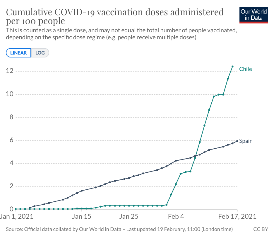 Durante el mes de febrero, Chile se ha convertido en la "revelación" de la "carrera" hacia la vacunación masiva. El país hispanoamericano arrancó el proceso a mediados de enero y, en las dos primeras semanas, no parecía avanzar a ritmo significativo. En cambio, las tres últimas semanas han puesto de manifiesto un rapidísimo salto adelante en el ritmo de vacunación.