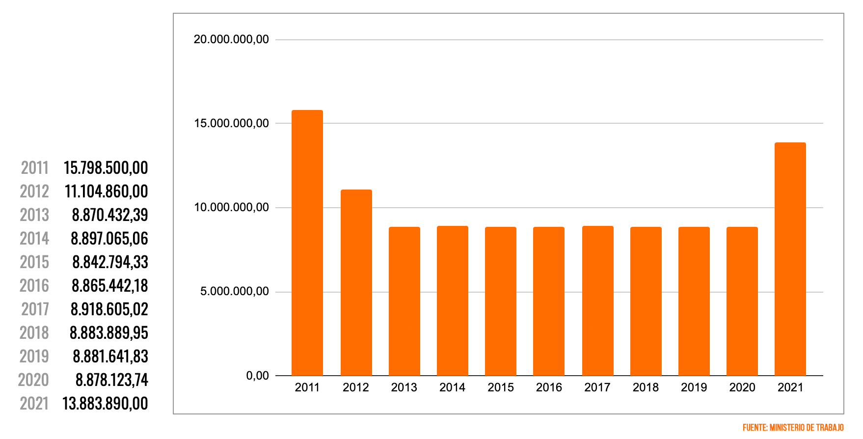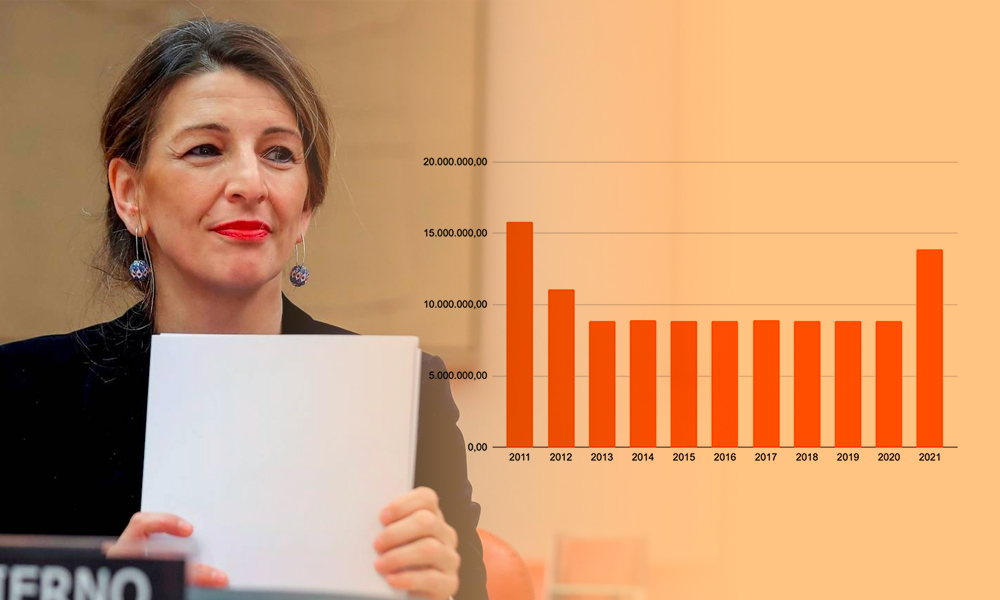 Esta cuantía supone disparar un 56% las subvenciones que se le otorgaron a CCOO o UGT un año antes: 8.878.123,74 euros. En el año 2013, en plena crisis del ladrillo, el Gobierno de Mariano Rajoy le asestaba un segundo recorte del 20% a estas partidas y, desde entonces, las subvenciones a los sindicatos no se habían movido del entorno de los 8.900.000 euros.