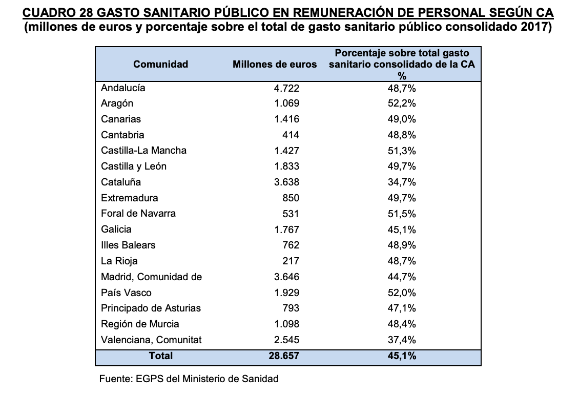 En promedio, la remuneración de personal del sistema sanitario público se lleva el 45,1% de todo el gasto comprometido por las comunidades autónomas. Madrid está prácticamente a la par con el promedio nacional, mientras que Cataluña se sitúa muy por debajo (34,7%) y también Comunidad Valenciana se anota registros claramente inferiores (37,4%). Las cotas más altas se dan en Aragón (52,2%), País Vasco (52%), Navarra (51,5%) y Castilla-La Mancha (51,3%).
