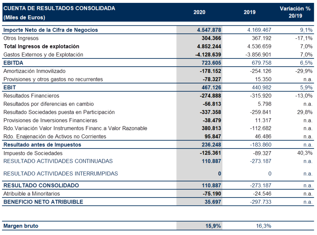 A cierre de 2020, la cifra de negocios de la compañía creció el 9,1 %, hasta los 4.548 millones de euros, según las cuentas remitidas a la Comisión Nacional del Mercado de Valores (CNMV).